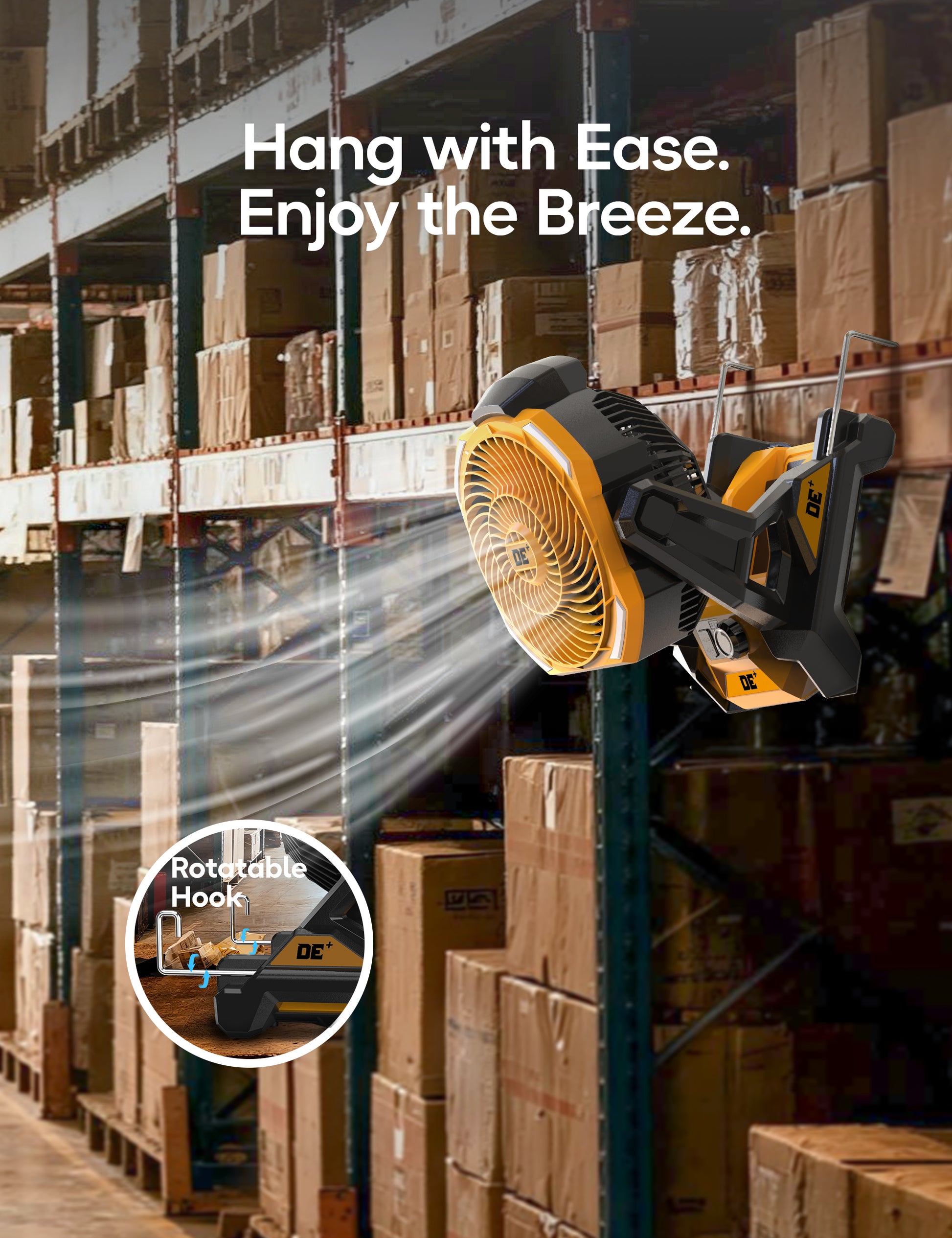 Battery Operated Fan, for DeWalt 20V Max Battery, Cordless Jobsite Fan for Camping, with LED Lights, Hook for Hanging, Variable Speed, for Workshops, USB Port(Bare Tool Only)